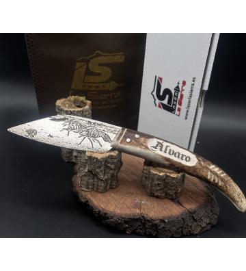 Navaja personalizada jarota asta de ciervo grande hoja recta grabada en hoja y mango